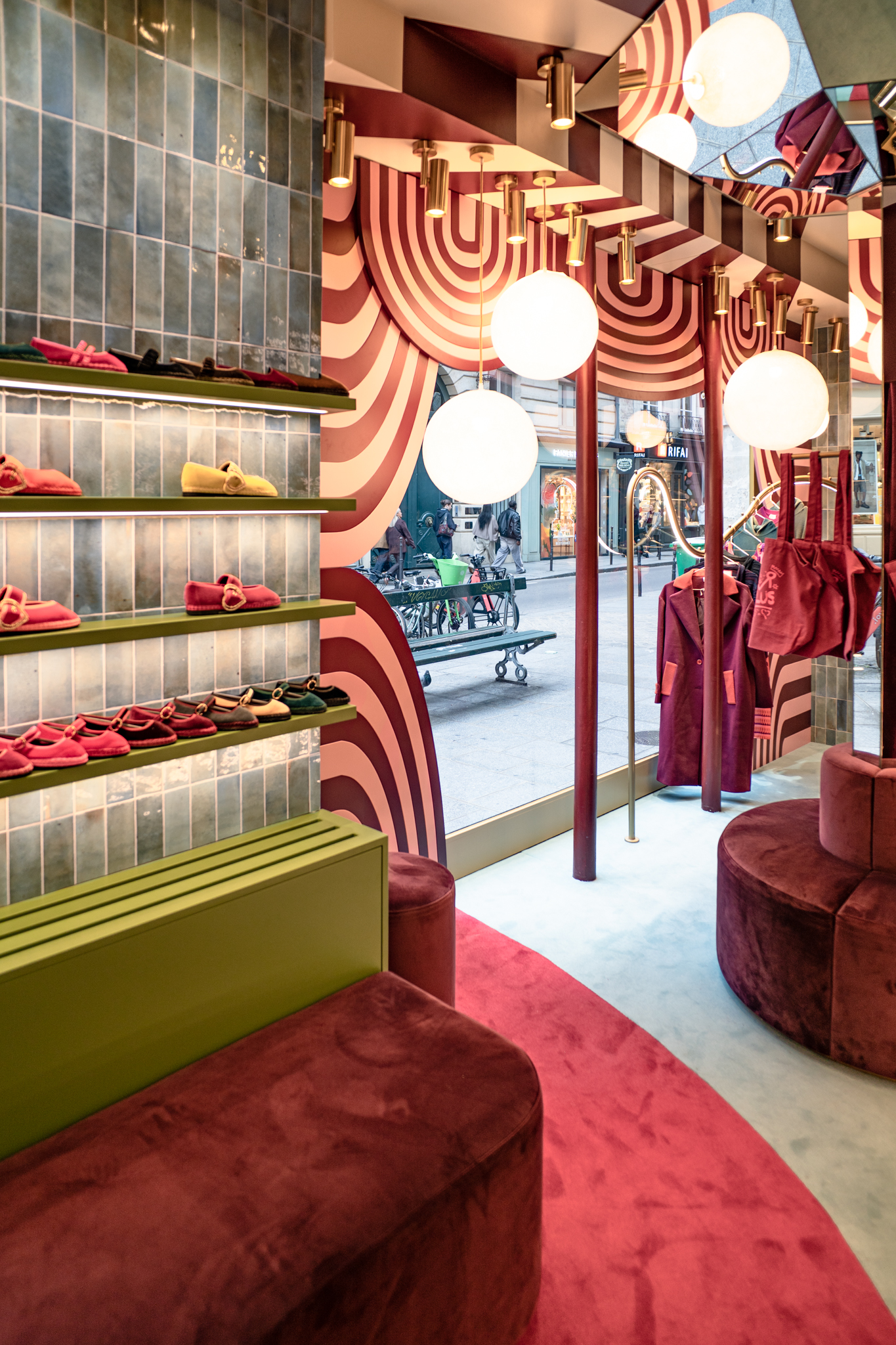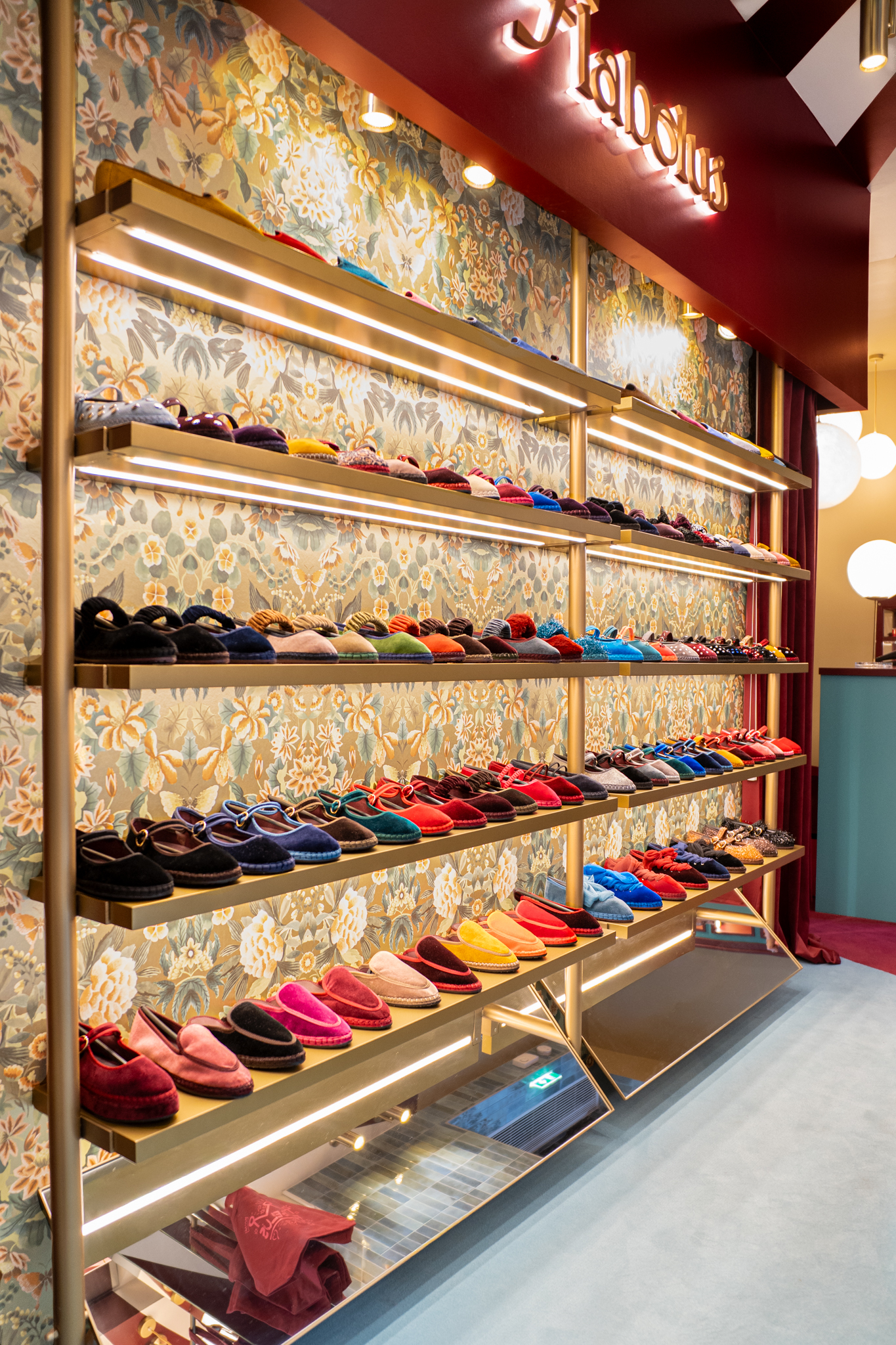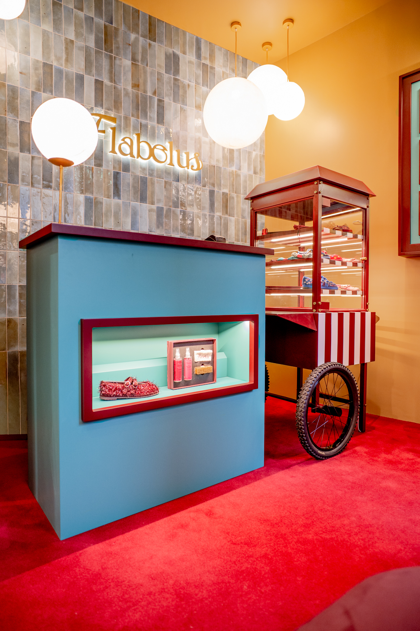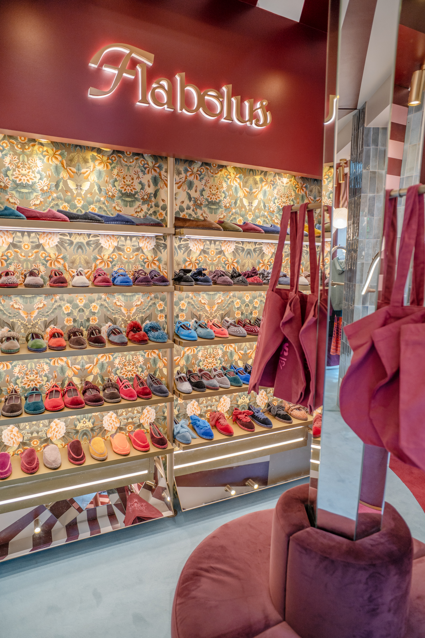A loja Flabelus Paris destaca-se por uma cenografia cromática marcante e por um cuidado especial nos detalhes. Os tons profundos dos lacados, combinados com apontamentos dourados e uma iluminação quente, criam um ambiente envolvente e acolhedor. As zonas de exposição e as vitrinas desenvolvem-se sobre fundos decorativos de inspiração floral, enquanto elementos como o carrinho-vitrine, a ilha central e os módulos de parede reforçam o carácter singular do espaço, através de jogos de cor, luz e profundidade. O conjunto é completado por superfícies espelhadas e peças estofadas em veludo, resultando num ambiente imersivo, sofisticado e imediatamente reconhecível.