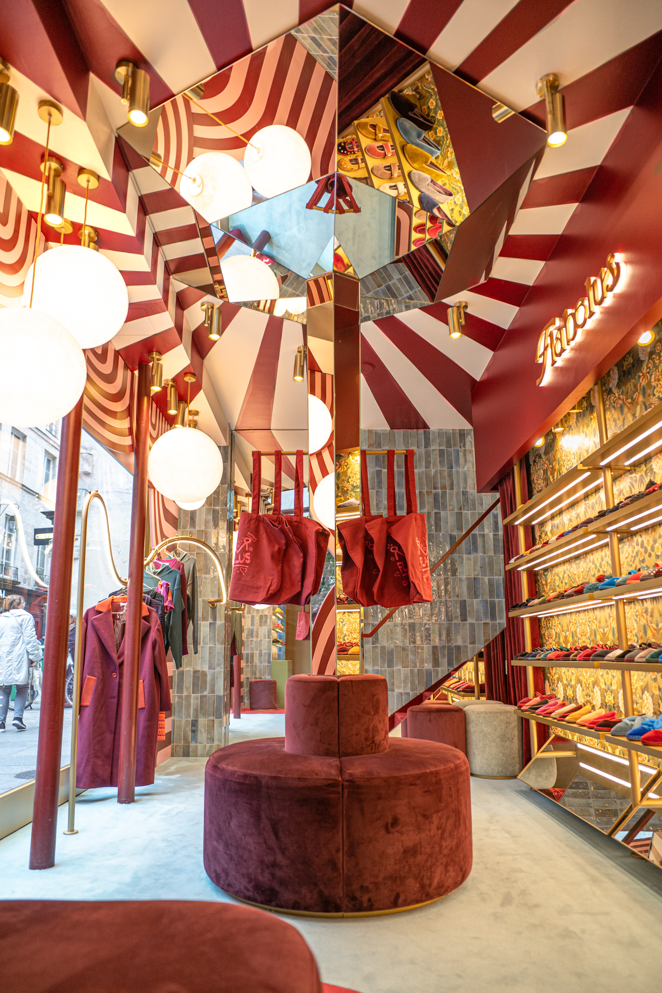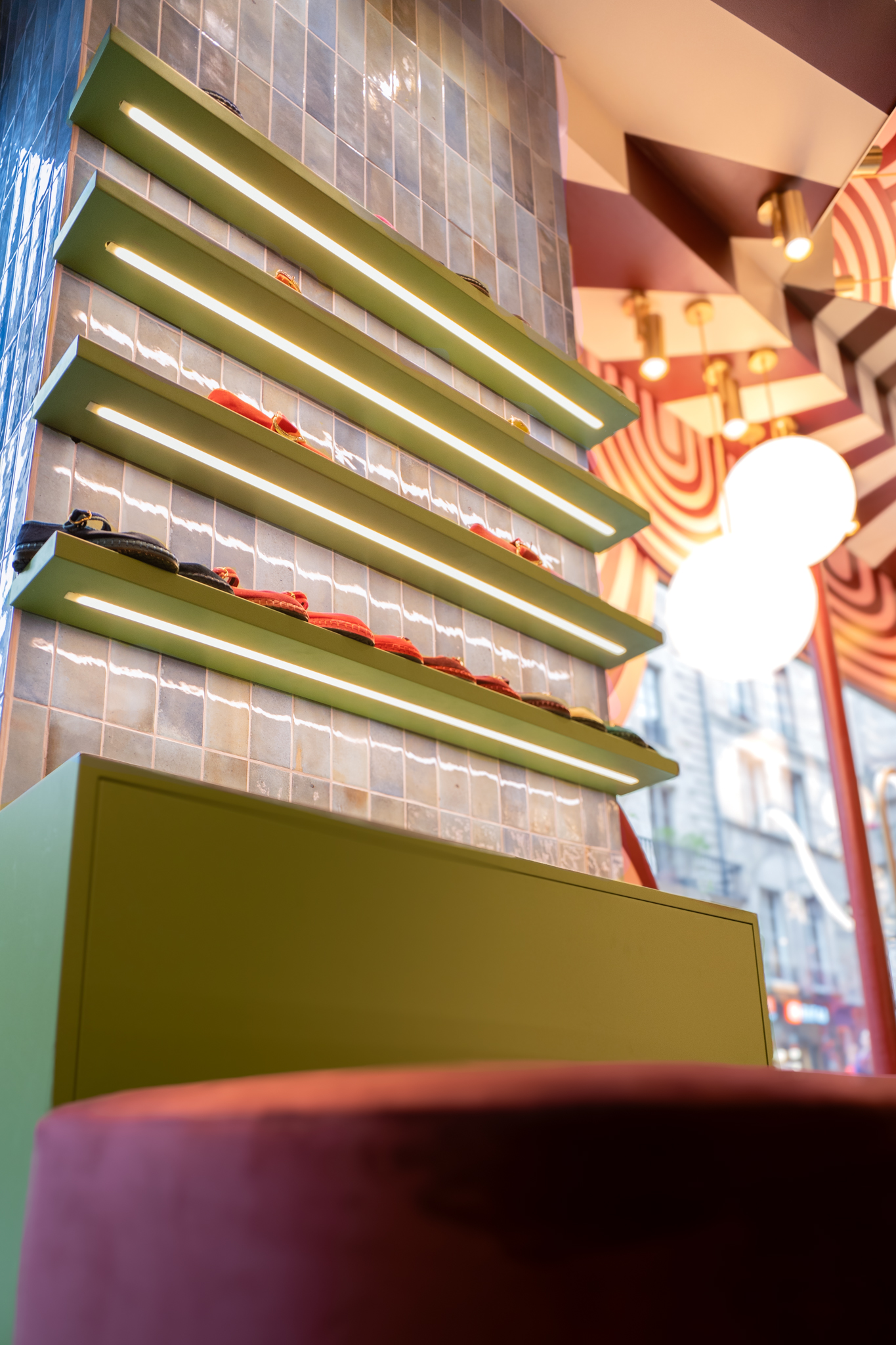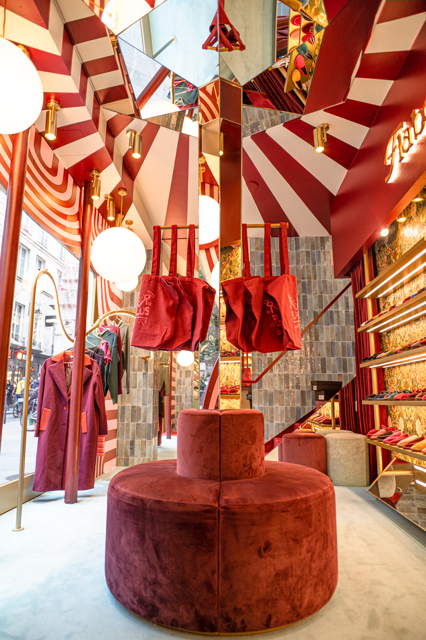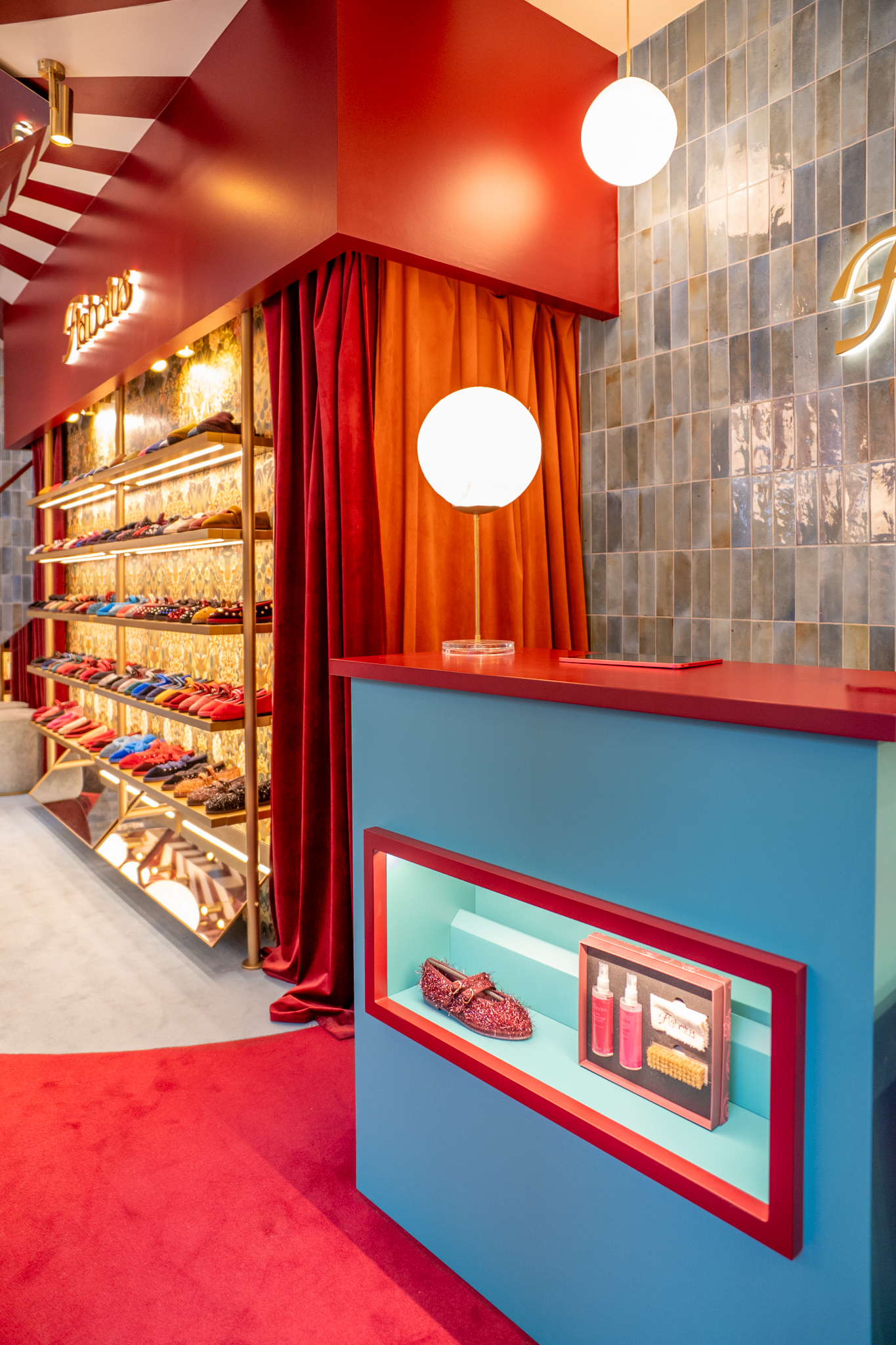 A loja Flabelus Paris destaca-se por uma cenografia cromática marcante e por um cuidado especial nos detalhes. Os tons profundos dos lacados, combinados com apontamentos dourados e uma iluminação quente, criam um ambiente envolvente e acolhedor. As zonas de exposição e as vitrinas desenvolvem-se sobre fundos decorativos de inspiração floral, enquanto elementos como o carrinho-vitrine, a ilha central e os módulos de parede reforçam o carácter singular do espaço, através de jogos de cor, luz e profundidade. O conjunto é completado por superfícies espelhadas e peças estofadas em veludo, resultando num ambiente imersivo, sofisticado e imediatamente reconhecível.