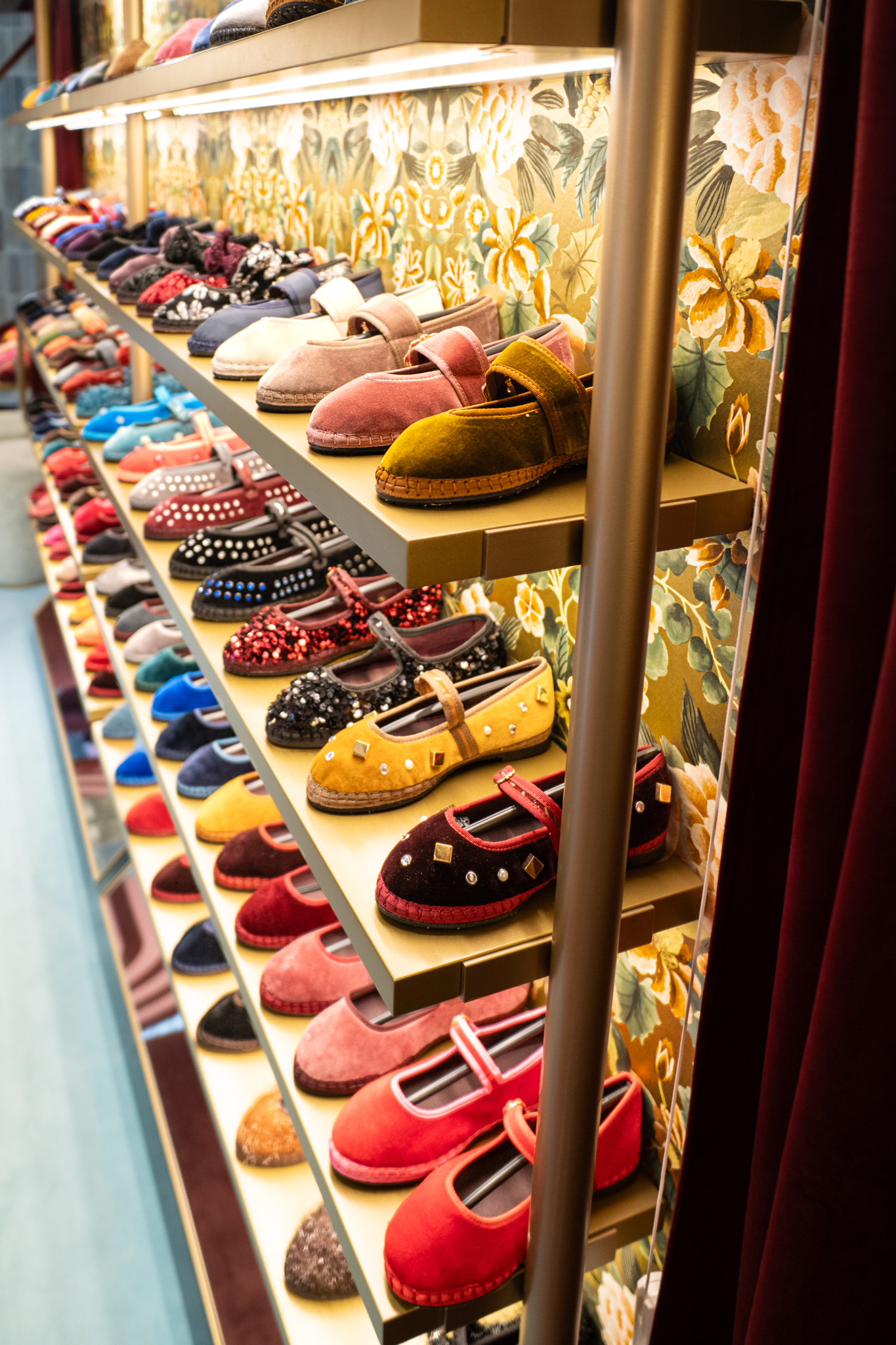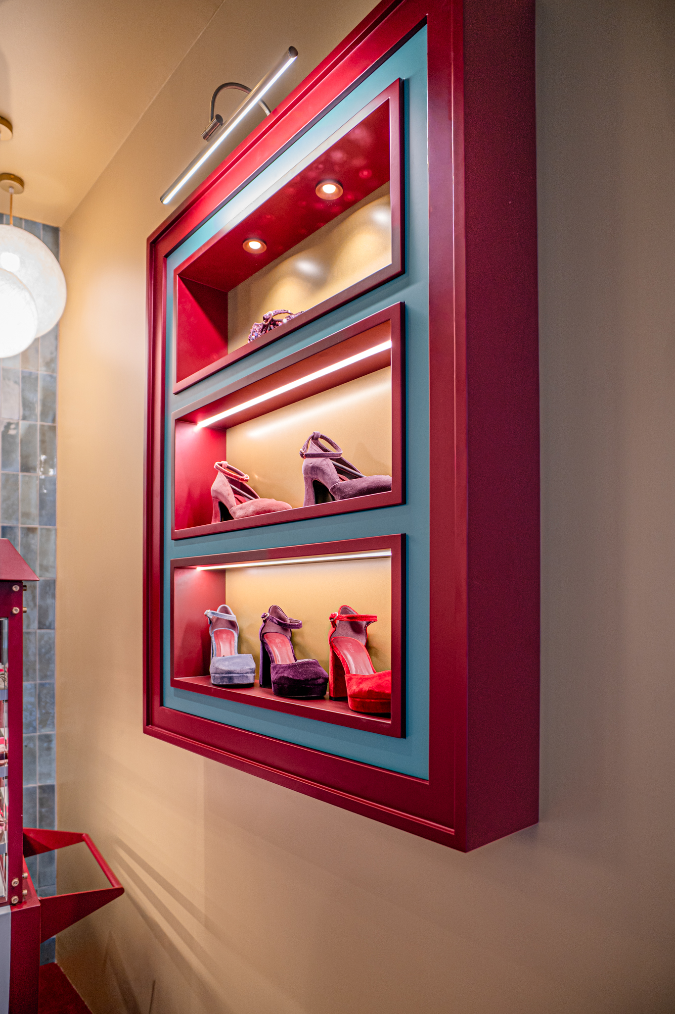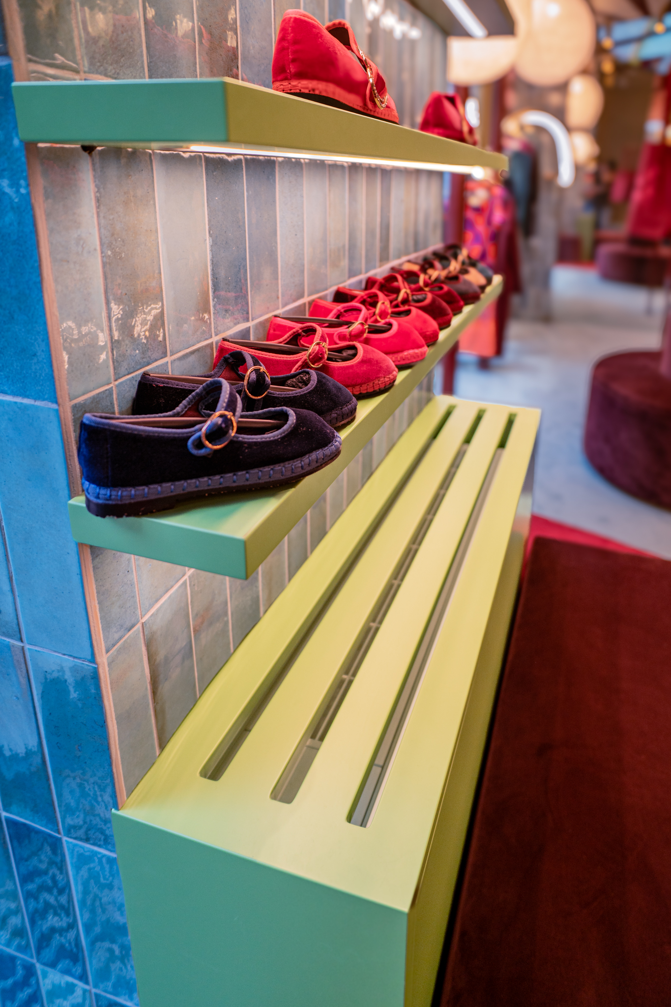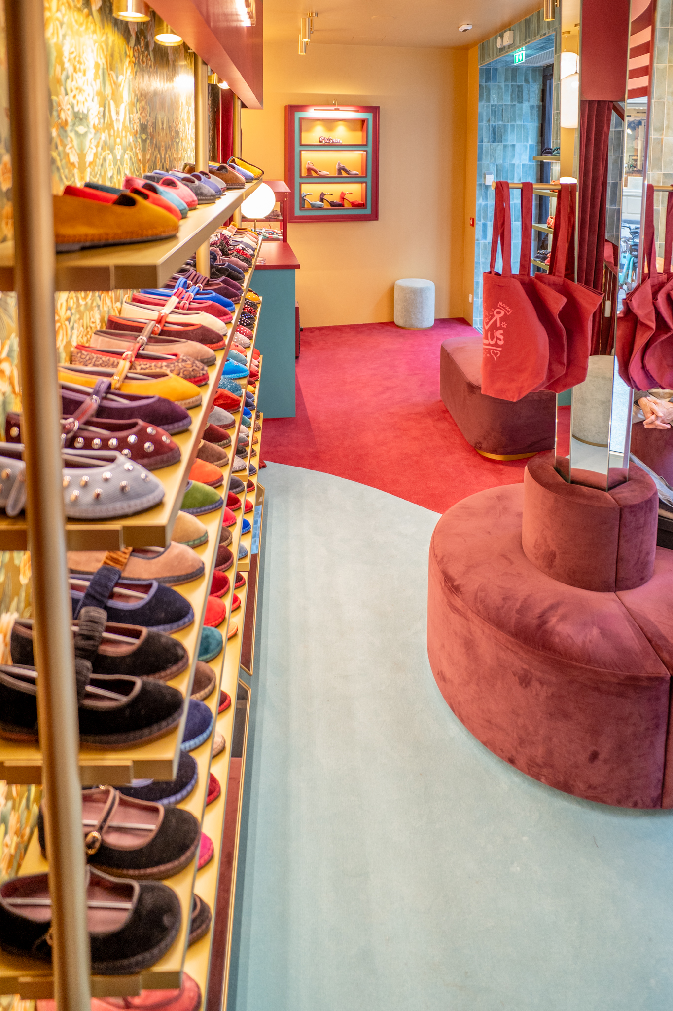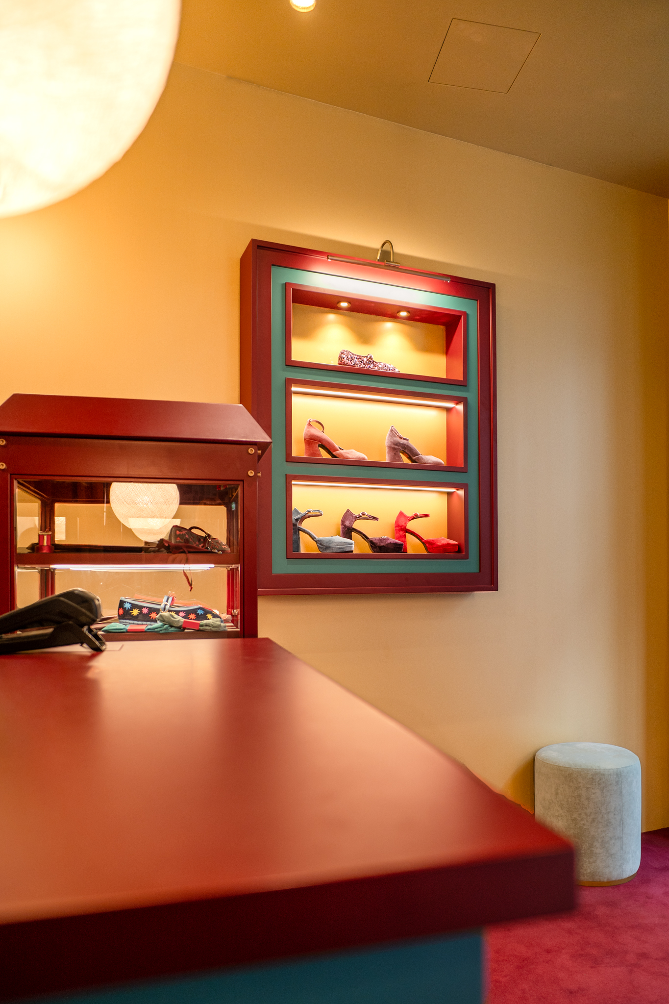 A loja Flabelus Paris destaca-se por uma cenografia cromática marcante e por um cuidado especial nos detalhes. Os tons profundos dos lacados, combinados com apontamentos dourados e uma iluminação quente, criam um ambiente envolvente e acolhedor. As zonas de exposição e as vitrinas desenvolvem-se sobre fundos decorativos de inspiração floral, enquanto elementos como o carrinho-vitrine, a ilha central e os módulos de parede reforçam o carácter singular do espaço, através de jogos de cor, luz e profundidade. O conjunto é completado por superfícies espelhadas e peças estofadas em veludo, resultando num ambiente imersivo, sofisticado e imediatamente reconhecível.