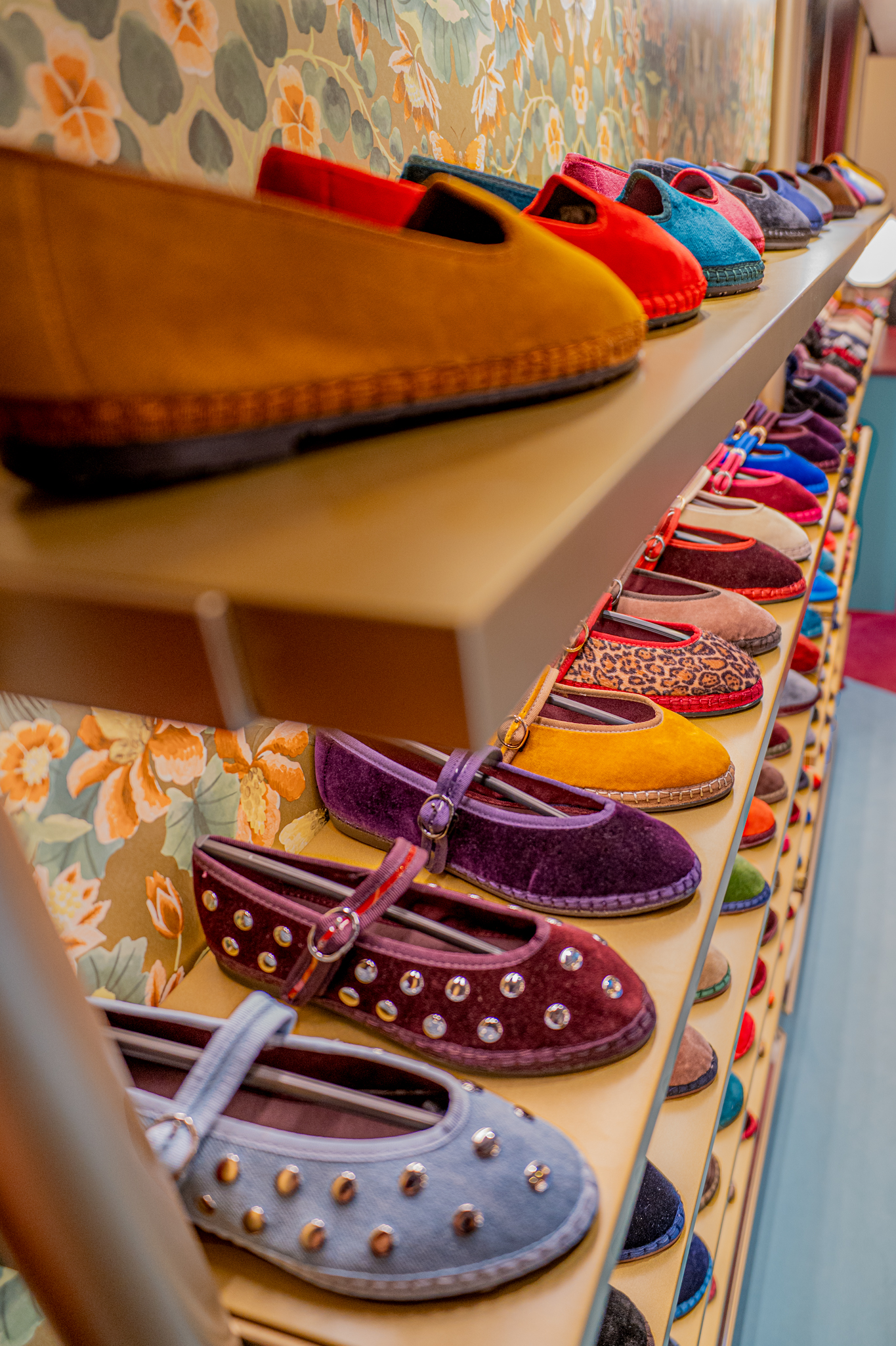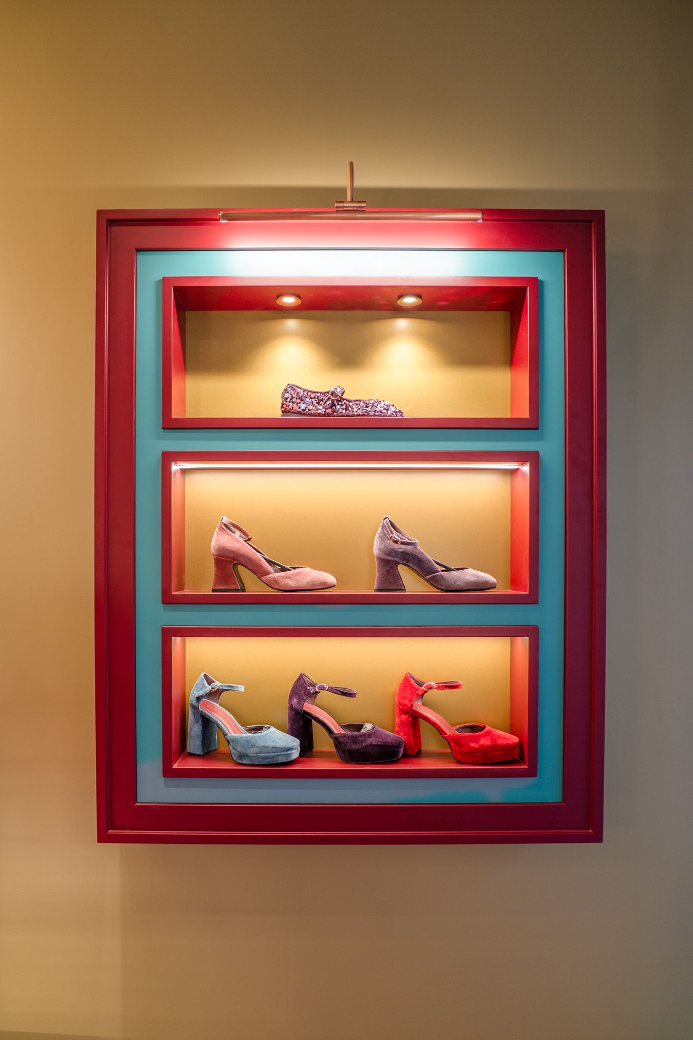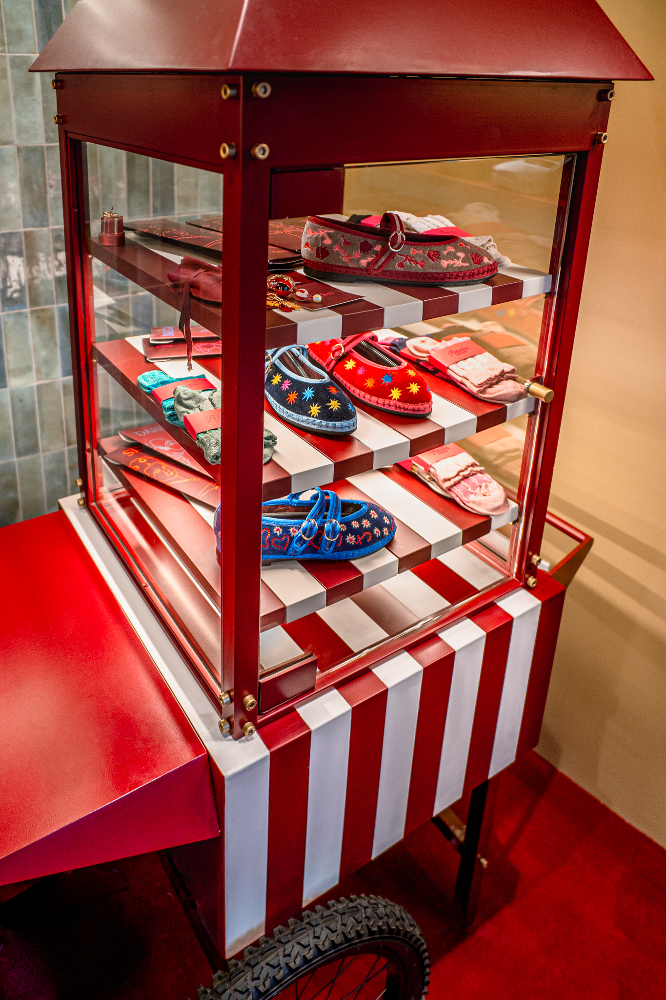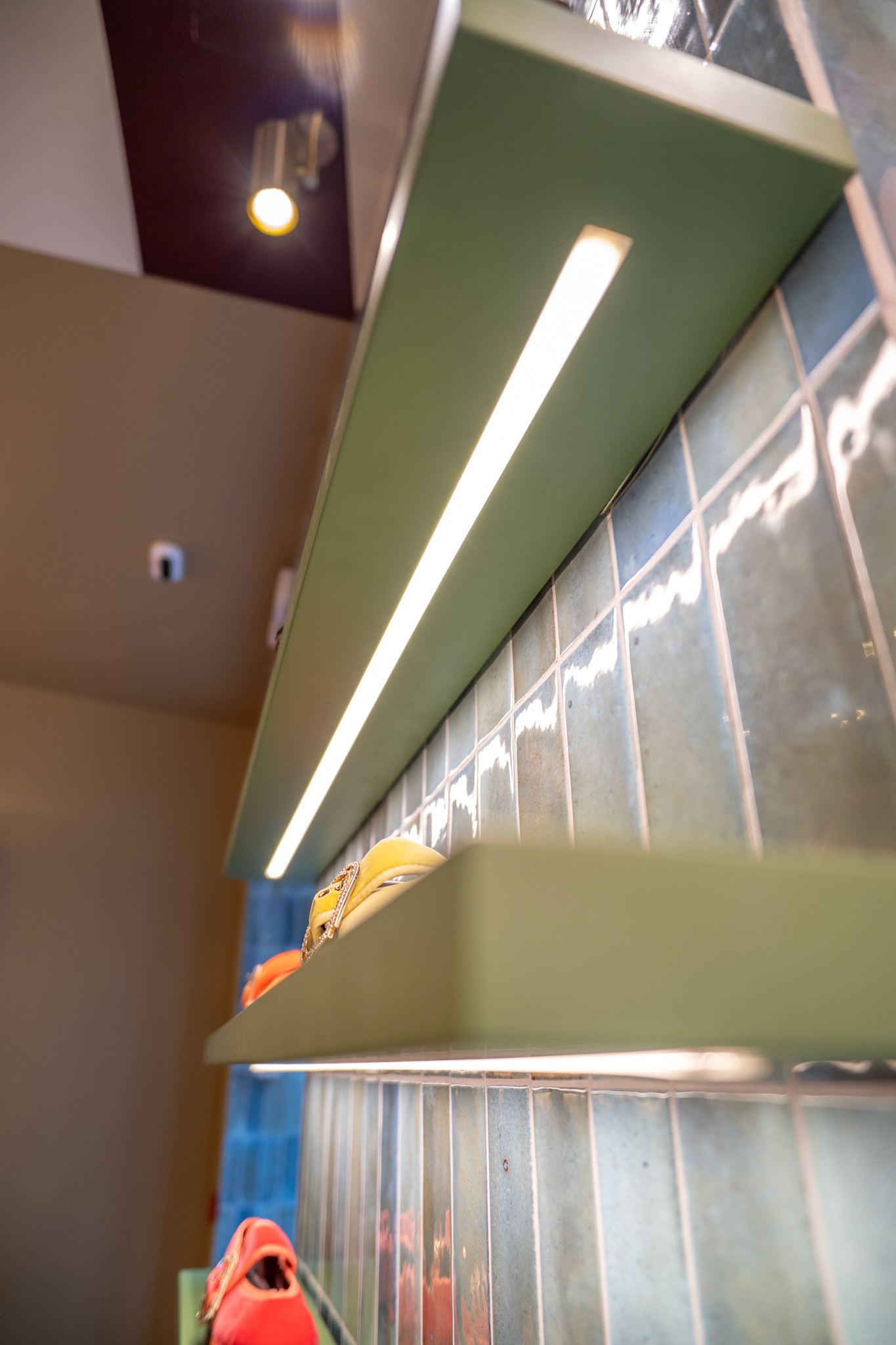 A loja Flabelus Paris destaca-se por uma cenografia cromática marcante e por um cuidado especial nos detalhes. Os tons profundos dos lacados, combinados com apontamentos dourados e uma iluminação quente, criam um ambiente envolvente e acolhedor. As zonas de exposição e as vitrinas desenvolvem-se sobre fundos decorativos de inspiração floral, enquanto elementos como o carrinho-vitrine, a ilha central e os módulos de parede reforçam o carácter singular do espaço, através de jogos de cor, luz e profundidade. O conjunto é completado por superfícies espelhadas e peças estofadas em veludo, resultando num ambiente imersivo, sofisticado e imediatamente reconhecível.